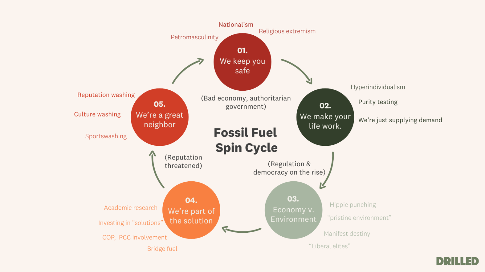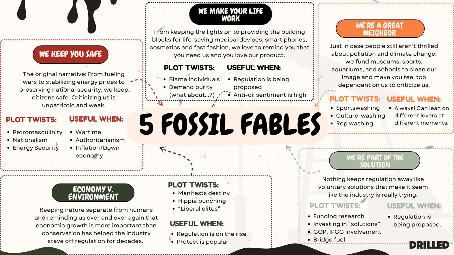The fossil fuel industry saw the benefit of shaping and leveraging the information ecosystem early on. It was one of the first major users of PR in the U.S. and it continues to spend more than most other industries. Similarly, fossil fuel companies saw the value of investing in university research as a way to shape policy as early as the 1920s. Despite the billions of dollars it’s spent on PR, research, and other information pollution strategies over the years, the industry and its favorite firms are not exactly innovative. They come back to the same five key narratives over and over again, leaning on whichever plays best at any particular point in time: