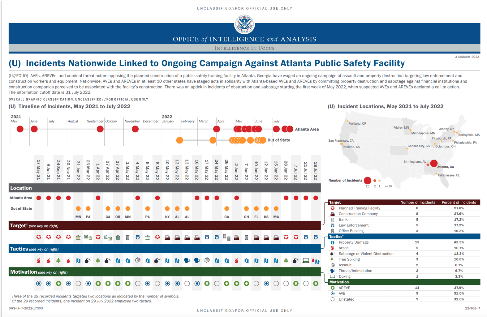 The January 3 DHS report included a tally of 20 actions committed by “suspected DVEs who cited AVE and AREVE ideology,” acronyms for anarchist violent extremist and animal rights / environmental violent extremist. They also identified nine additional Cop City-related “criminal incidents” not attributed to domestic violent extremism. The activists primarily targeted law enforcement, construction companies, and banks, according to DHS, and committed assaults, arson, tree spiking, and doxxing.