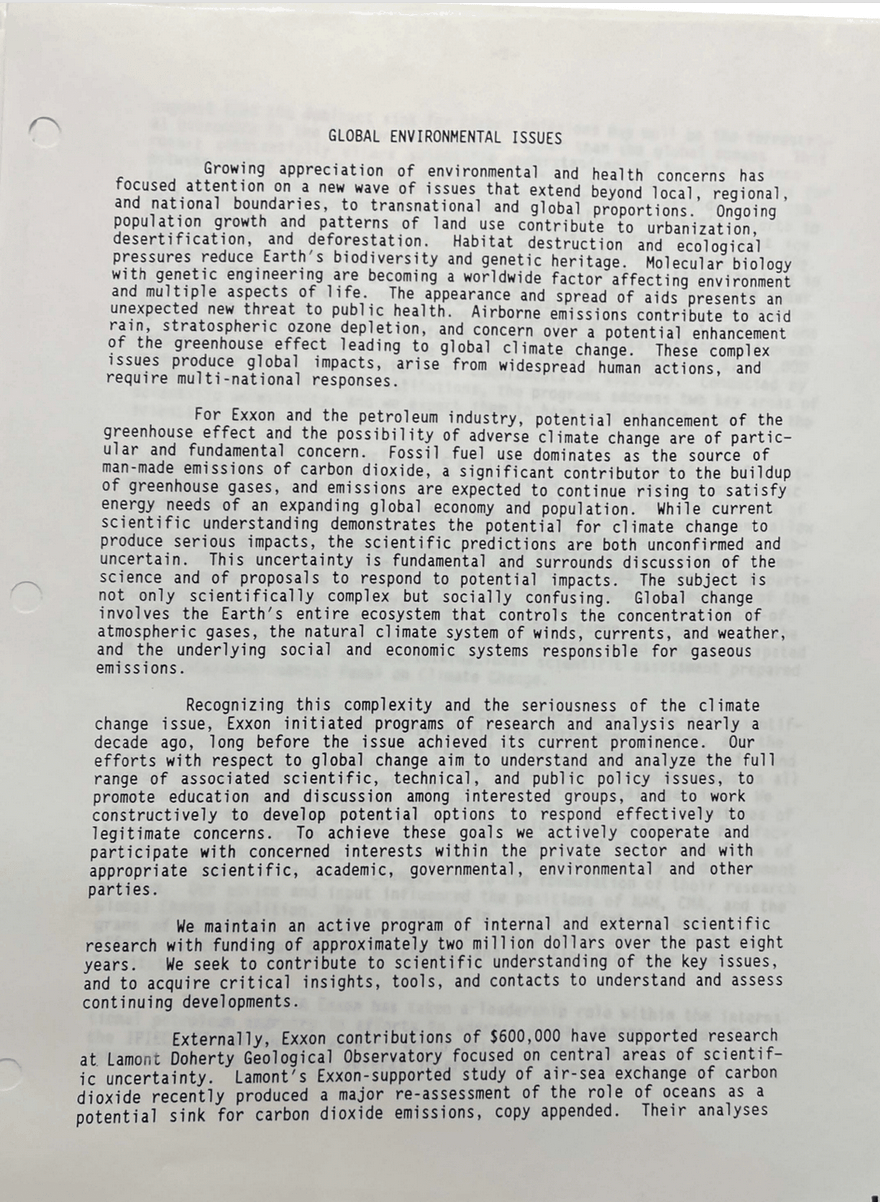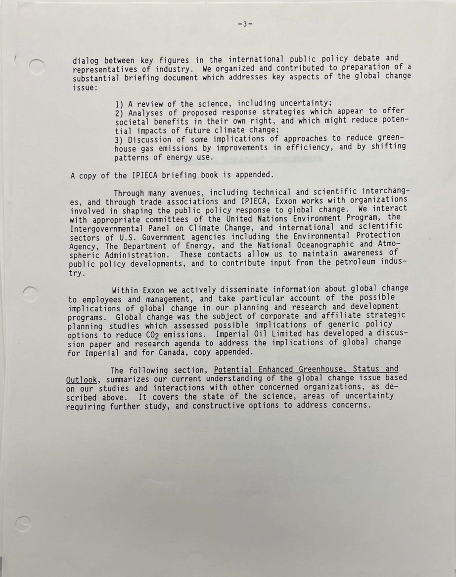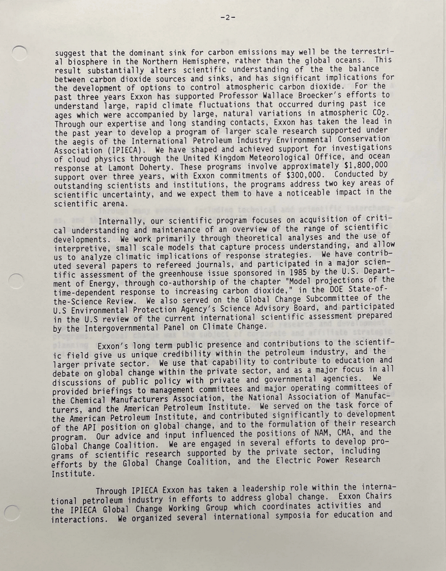 A 1991 internal report outlining Exxon’s leadership on the issue of “global change,” appended to a copy of a 1989 presentation of what the company knew so far about the “potential enhanced greenhouse effect,” highlights Exxon’s leadership role on climate in particular within Ipieca. “Through our expertise and long standing contacts, Exxon has taken the lead in the past year to develop a program of larger scale research, supported under the aegis of the International Petroleum Industry Environmental Conservation Association (IPIECA),” the report read. “ ...Through IPIECA Exxon has taken a leadership role within the international petroleum industry in efforts to address global change. Exxon chairs the Ipieca Global Change Working Group which coordinates activities and interactions. We organized several international symposia for education and dialog between key figures in the international public policy debate and representatives of industry.”