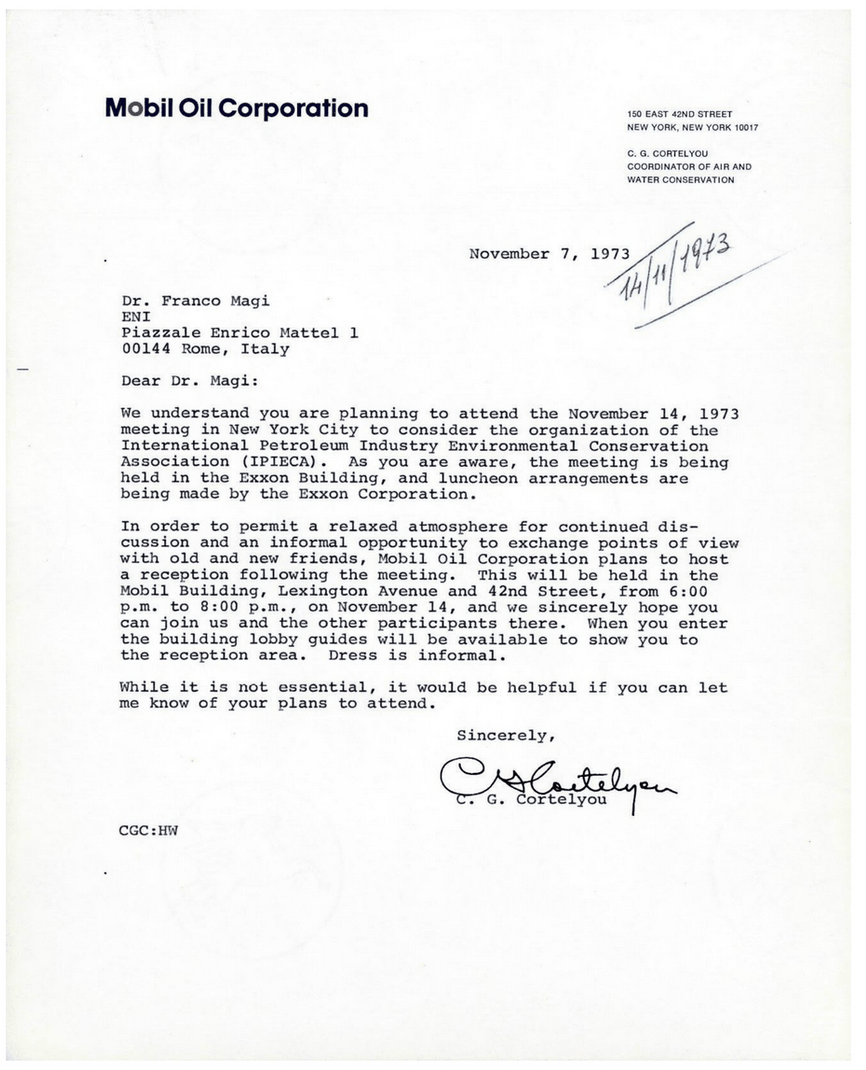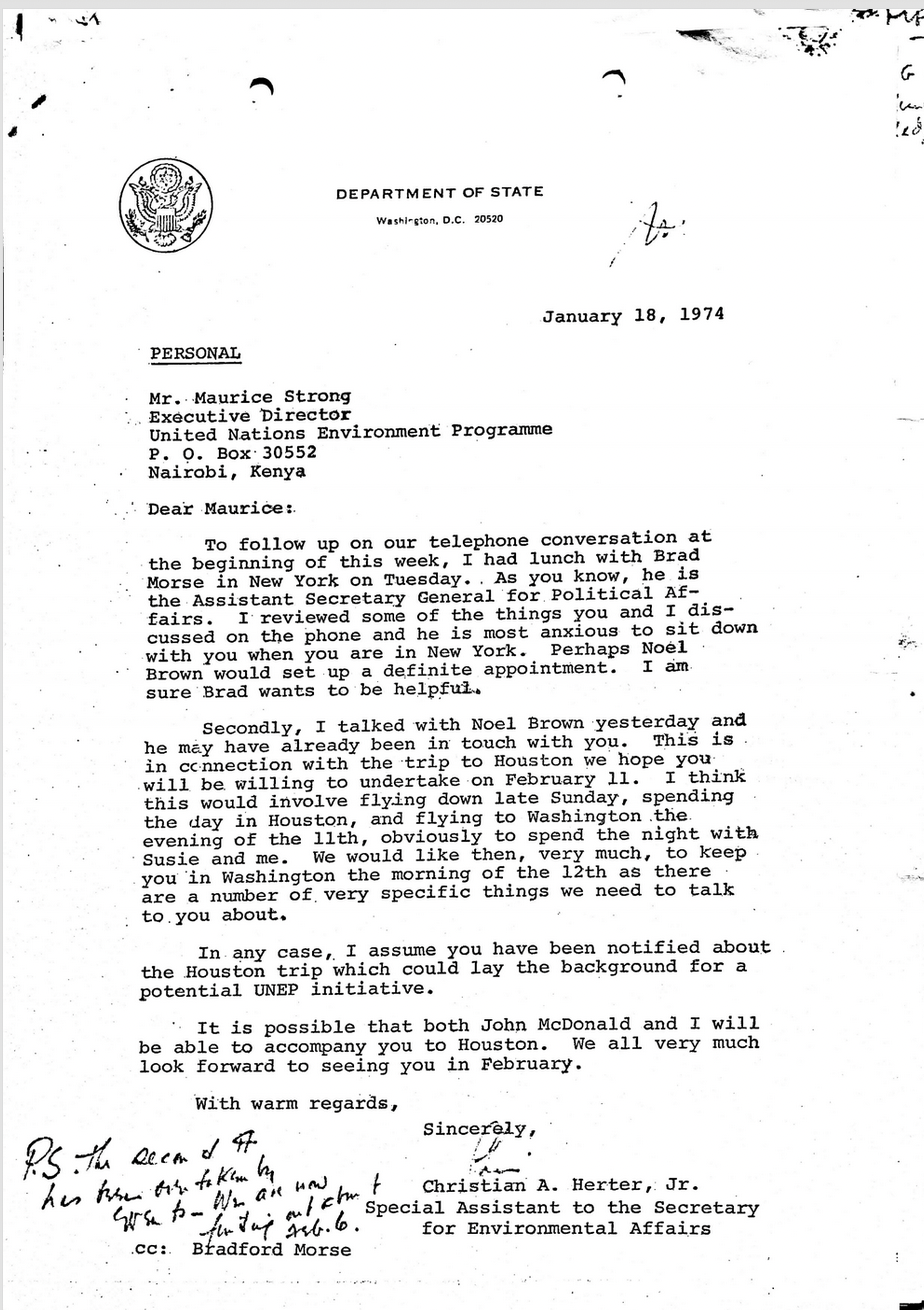 Against this backdrop, there was a growing feeling within the international community that given the global nature of various polluting industries, it would be helpful to have a point of contact on issues that concerned each industry. Documents show that one of the early agenda items for UNEP was the creation of an Industry Program that could enable UNEP to work directly with various polluting industries. By 1973, the petroleum-focused group already had a name—the International Petroleum Industry Environmental Conservation Association, or IPIECA. Even before the UN announced the official launch of IPIECA, Exxon had taken a leadership role in it, hosting one of the first meetings to discuss the group at its headquarters in New York. Herter got involved here too, coordinating a UNEP trip to Houston to “lay the groundwork for a potential initiative.”