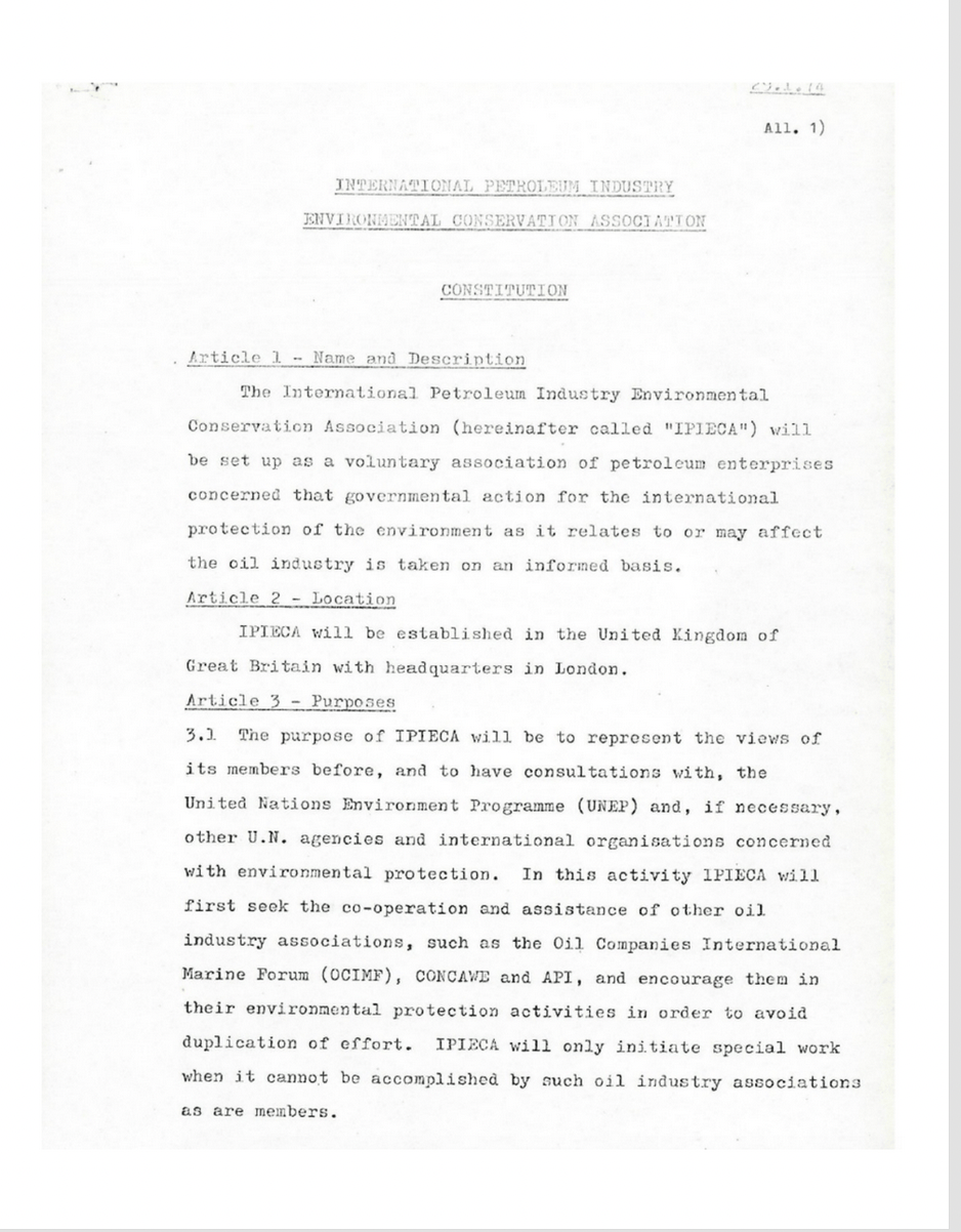 This “active role” is consistent with the organization’s activities from the time of its creation, where it has helped to set the global regulatory agenda on environment and climate issues. Although Ipieca has organized meetings, working groups and industry-wide protocols for events like oil spills, documents emphasize the organization’s role in strategizing around international environmental policy to ensure the least negative financial impact on the industry. In its organizing articles, Ipieca notes that its purpose is both to gather data and information on global environmental issues of interest to the industry and UNEP and for the UN to give the industry a heads-up on pending regulatory shifts, via “early notification and evaluation of programmes under consideration by UNEP which would have an impact on oil industry operations.” In its original constitution, Ipieca describes itself as “a voluntary association of petroleum enterprises concerned that governmental action for the international protection of the environment as it relates to or may affect the oil industry is taken on an informed basis.”