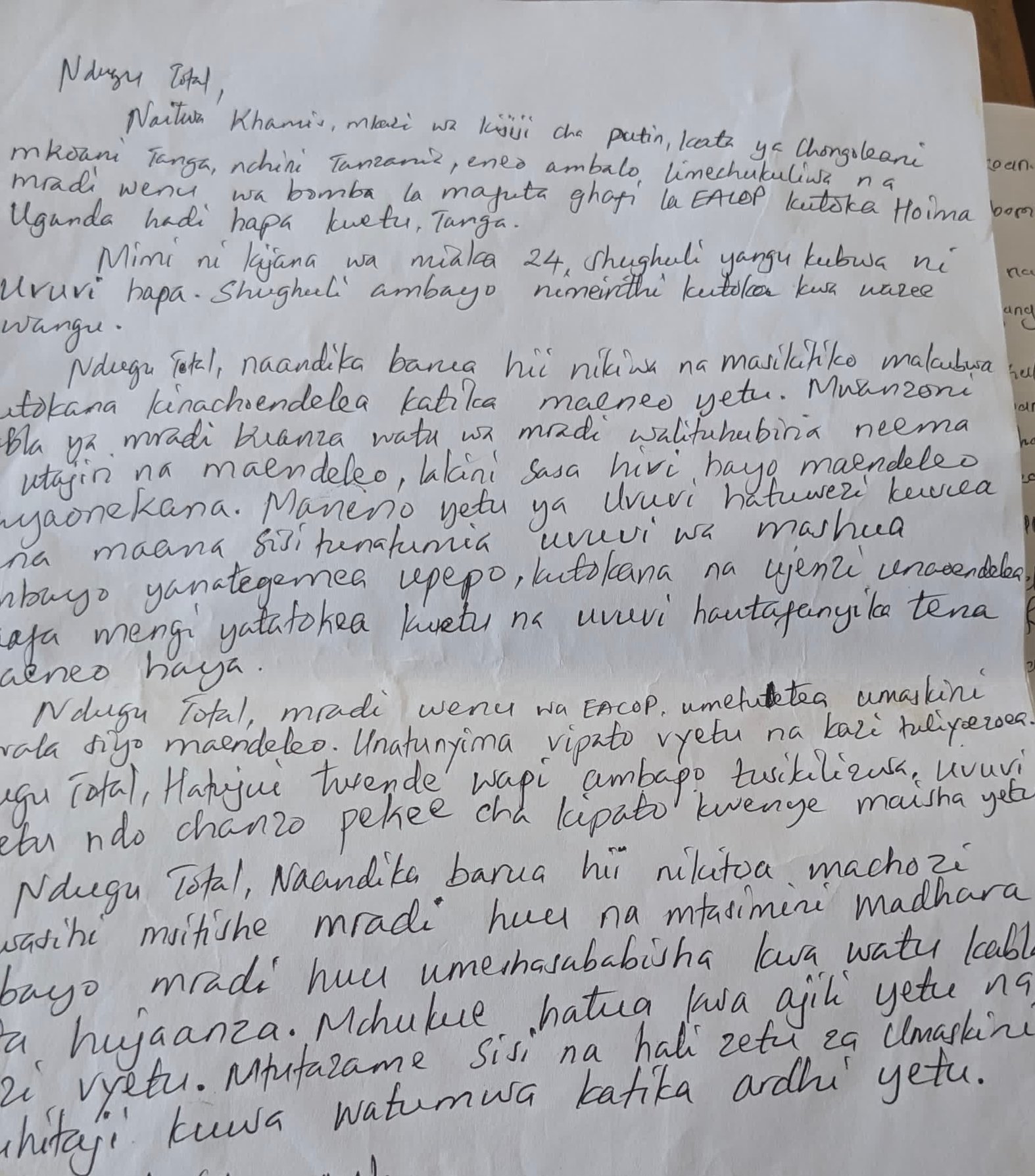 Handwritten letters to Total Energies from Tanzania’s youth. [Credit: Baraka Machumu]