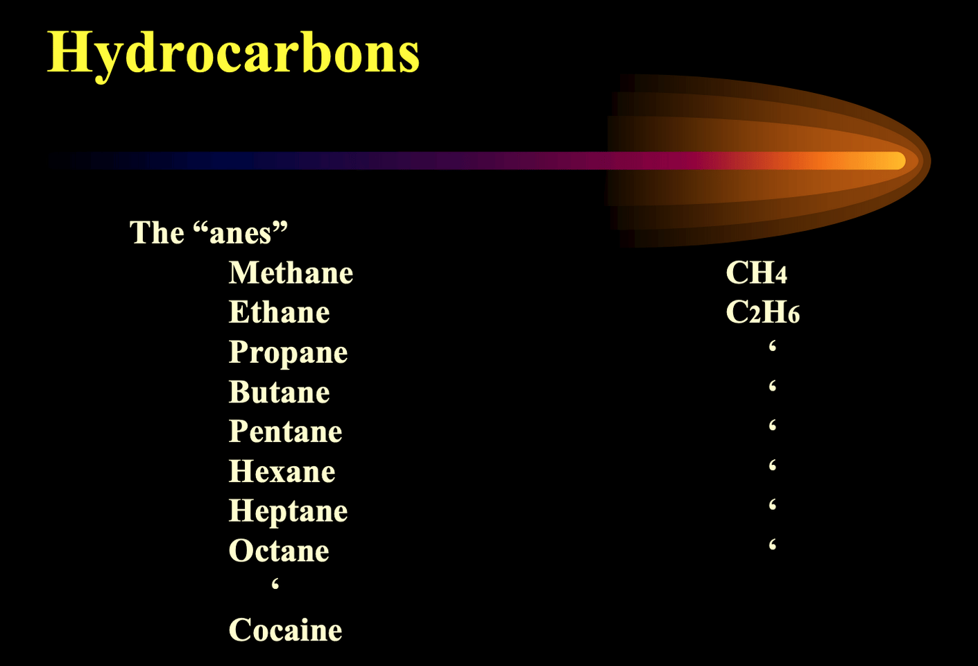 There are some other interesting slides, like one where Tobin explains how different hydrocarbons end in “ane,” and then adds, for some reason, “cocaine.”