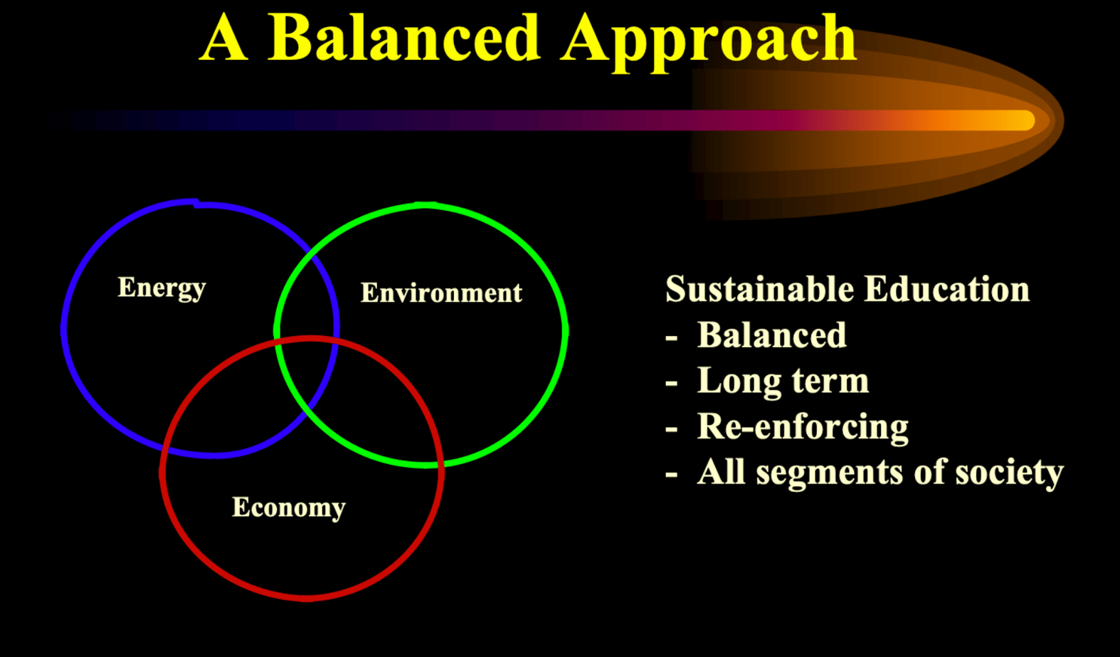 The idea is that every policy decision must weigh the impact on each of these three facets of human life. Exxon used this three Es paradigm, too—they called it the “energy cube.”