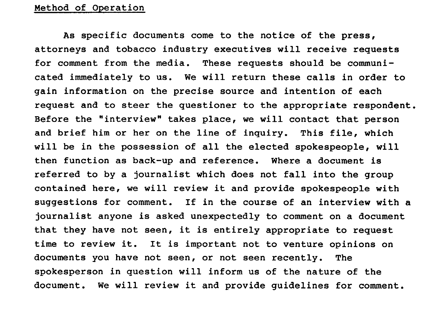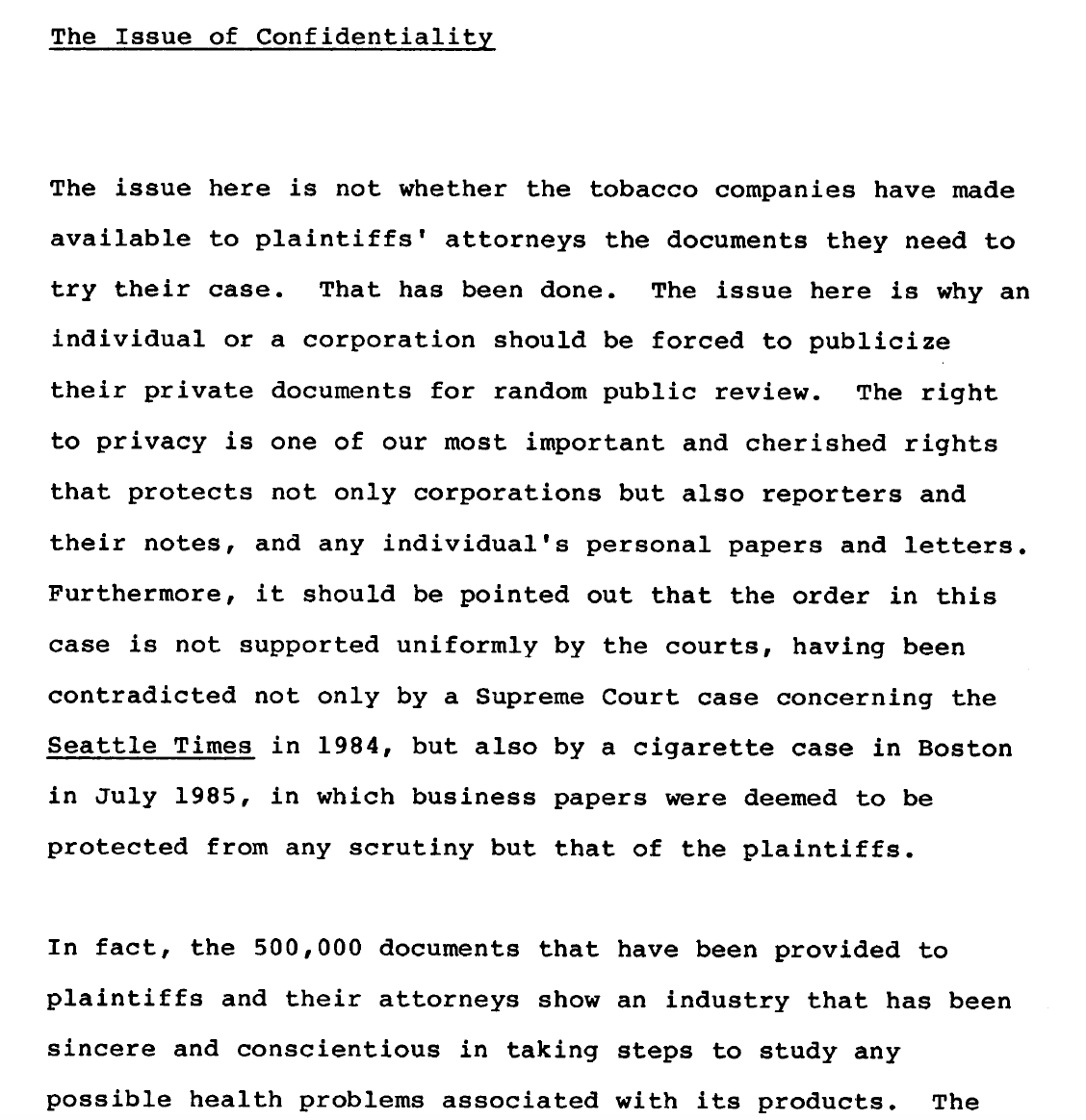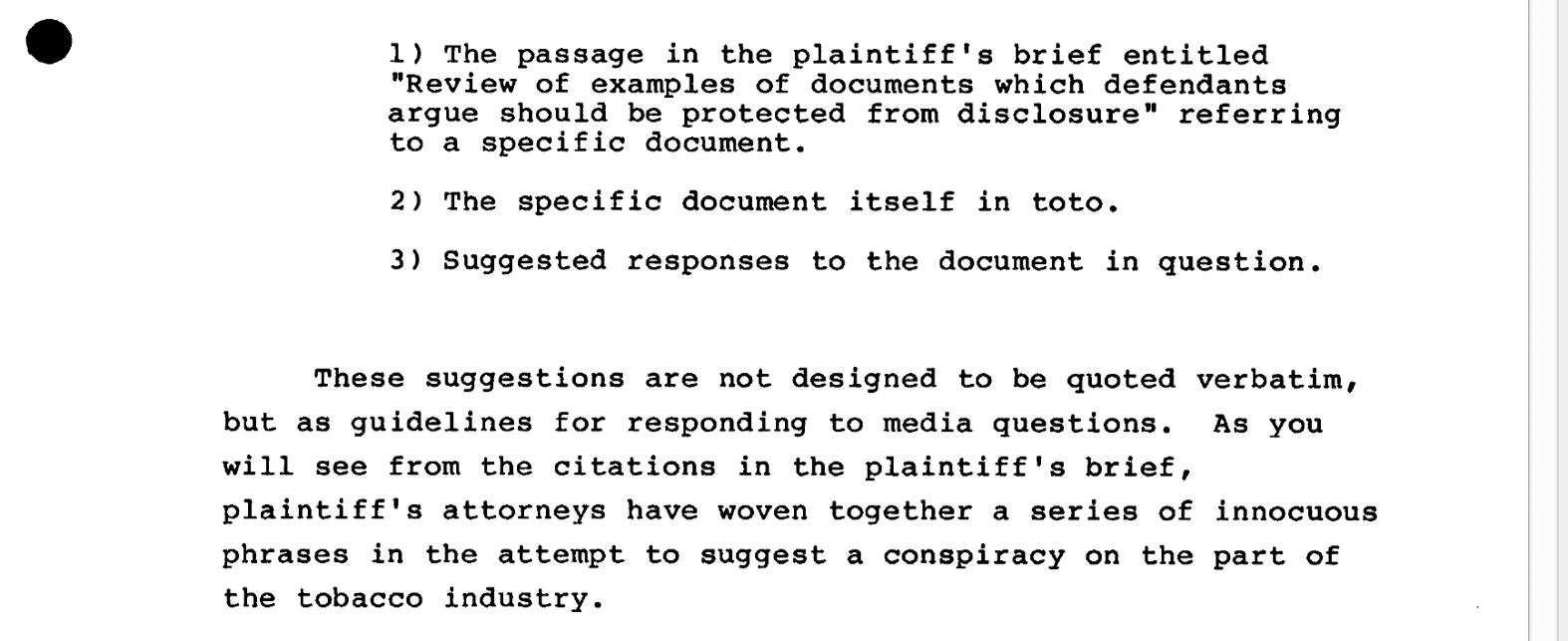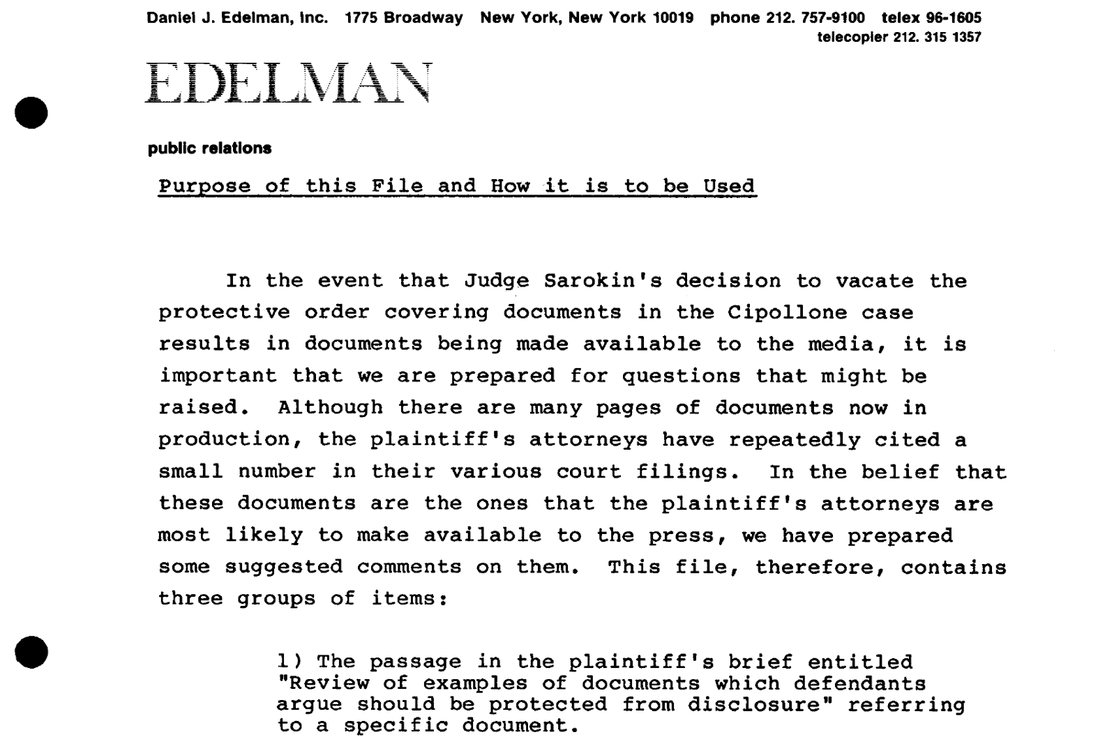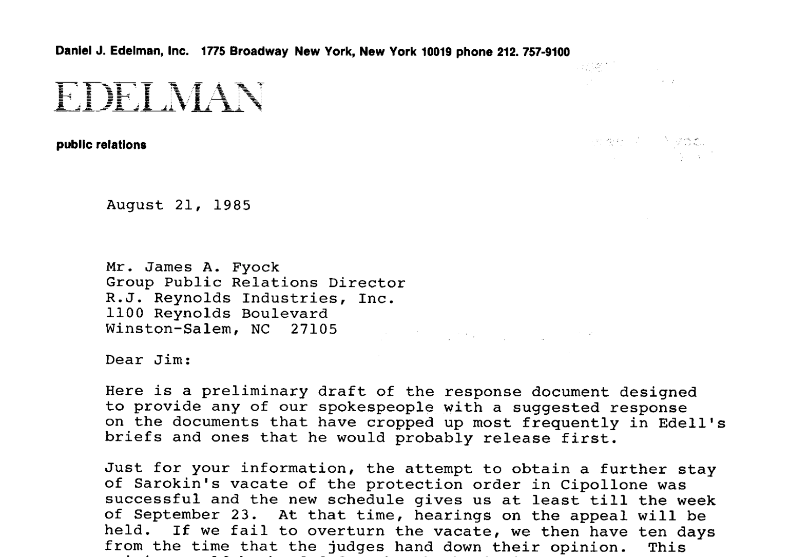 The proposal was a success—Edelman was still advising R.J. Reynolds in 1985, per documents in the Industry Archive at UCSF. In the document highlighted below, for example, an Edelman exec on the account is advising RJR how to handle the hundreds of internal industry documents that had, by that point, become public.
