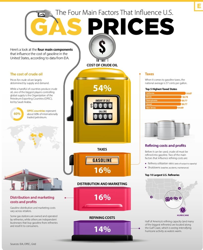 This one gets trotted out every time any government even attempts to pass climate policy, and it works because most people—reporters included—don’t actually know how the price at the pump or residential energy prices are set. But it’s not that complicated! In fact, the U.S. Department of Energy even has a very handy, simple graphic explaining it (see below). The biggest determinant here is the price of crude oil. Ultimately, robust climate policy would make this go down. It could increase prices in the meantime; the American Petroleum Institute has tried to claim, for example, that a move to pause leasing for oil and gas exploration on federal land led to a higher price at the pump. At the time, in 2022, it was far more likely that price fluctuations were being caused first by the threat of Putin invading Ukraine and then by the invasion itself. It’s important to note here that, despite industry claims to the contrary, the commodity price per barrel of oil does not typically map to actual supply and demand, but rather to perceived changes to that supply and demand and how commodity traders are feeling about them.