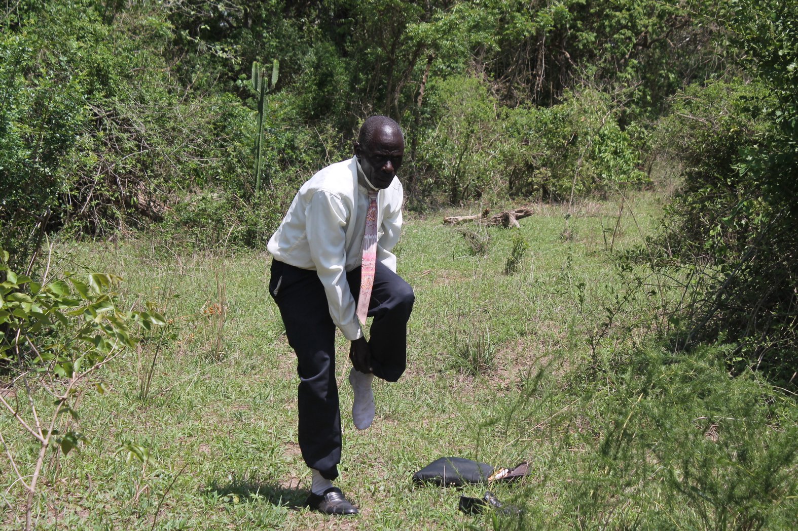 Alex Wakitinti removes his shoes before stepping onto a sacred natural site used for traditional prayers by the Bagungu tribe in Buliisa District. Photo by Diana Taremwa Karakire