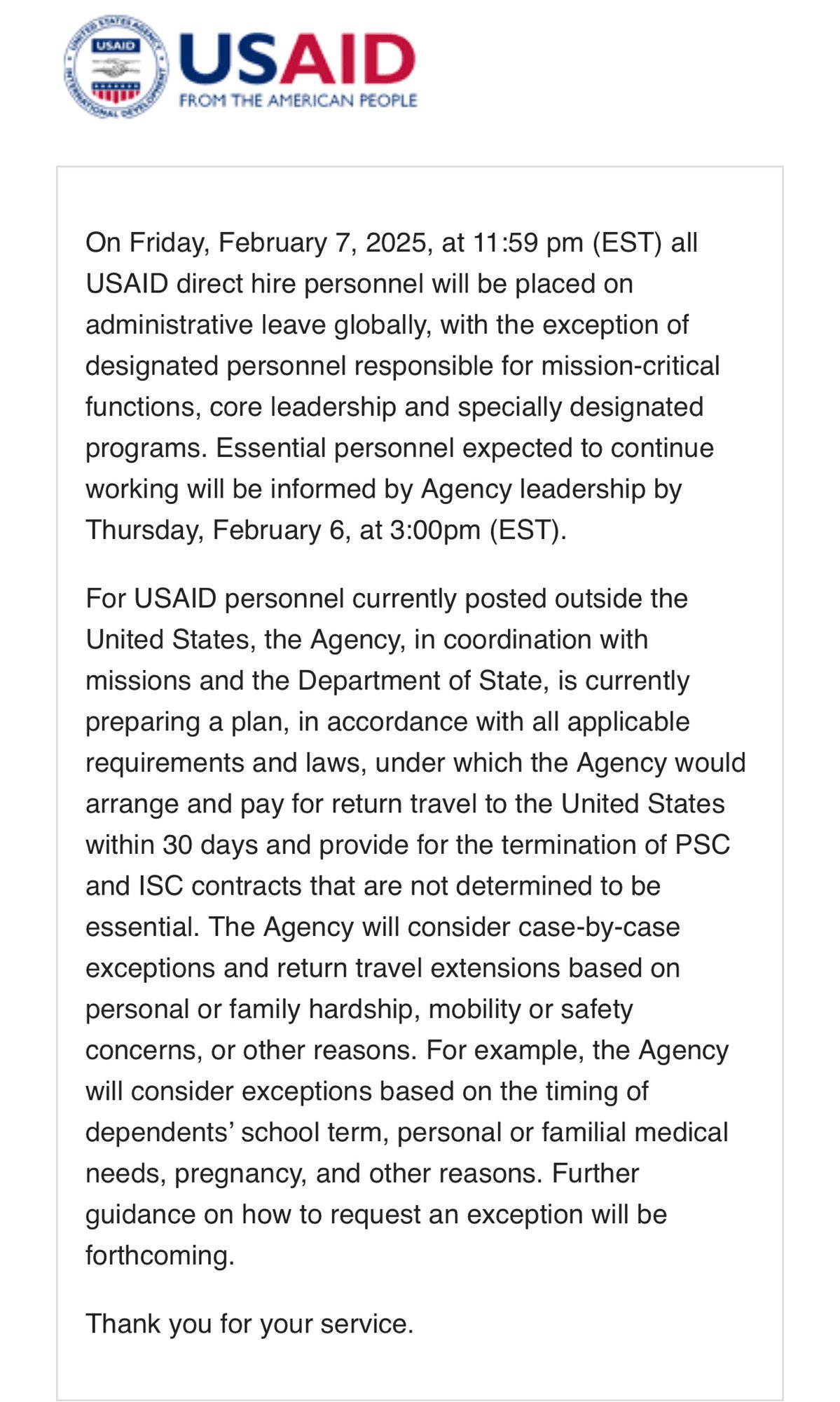 USAID - Climate page down as of Feb 1. It’s been archived here. Over the weekend following, the entire USAID was shut down by Elon Musk and DOGE, neither of which has been approved by Congress. As of Feb 5, 2025, the entire USAID website is gone, replaced with a memo: